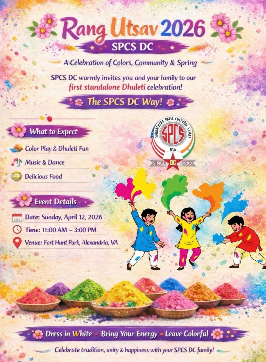 SPCS DC warmly invites you and your family to *Rang Utsav 2026*, our first standalone Dhuleti celebration. Join us as we welcome spring with vibrant colors, joyful music, delicious food, and community togetherness.